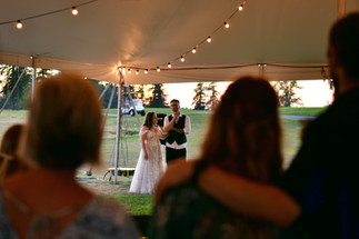 Drew & Karli made a grand entrance out of the golf course club house to the big white tent where their friends and family were waiting and cheering them on. The couple was ready to celebrate after an intimate ceremony up at Mount Baker earlier that day. The appetizers and dinner catered by North Bellingham Golf Course were delicious, followed by a cookie bar for dessert. There were several lawn games to choose from that kept guests entertained throughout the evening - the bride and groom even made their own cornhole boards out of old skis. Vibrant wildflowers topped every table and guests were greeted with a custom temporary tattoo station to join in on the couples’ love for tattoos. There were so many personalized details throughout that showed who they are and what they enjoy together. The night ended with a beautiful sunset and an open mic where friends and family shared about Drew & Karli.